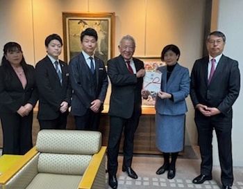 12月26日、名古屋美術商協同組合の古川祐司理事長らが当事業団を訪れ、14日に開いた歳末チャリティー茶会の茶券の売り上げや会場での募金などをお届けくださいました。