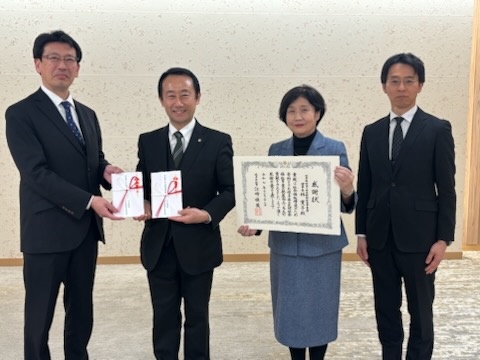 12月25日、稲沢市職員互助会の清水澄副市長らが当事業団を訪れ、会員からの善意、リンゴやハムなどのあっせん販売の収益金の一部をお届けくださいました。